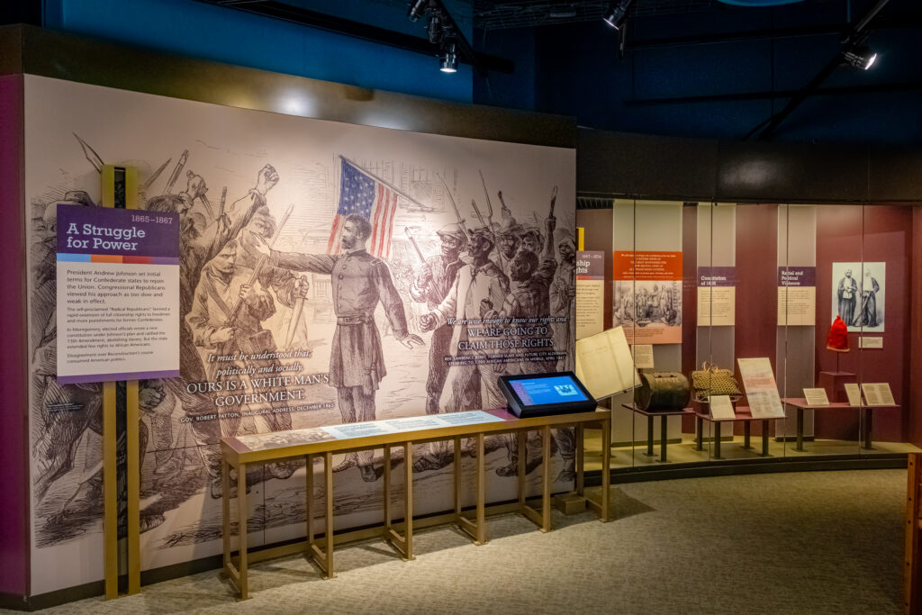 Additional exhibits in the historic Archives building explore other ways of understanding the story of what Alabamians share and what makes them unique: the land, the rise of early cultures, what we have “valued” from the past, and the intertwined folk traditions that thrive as a shared heritage. Throughout the Museum, graphics inspired by Alabama quilts express that Alabama’s history is the sum of many parts.